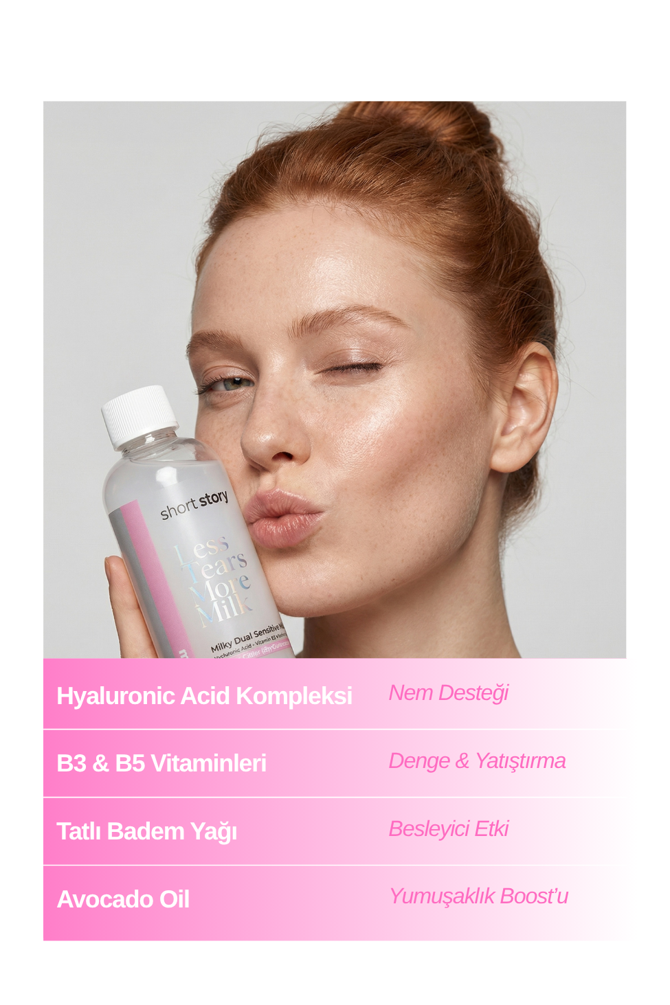 Çift fazlı misel formülü ile suya dayanıklı makyajı ve göz makyajını temizlemeyi temizler. Hyaluronik asit kompleksi, niasinamid ve pantenol ile cildi nemlendirir ve besler. Tatlı badem ve avokado yağı ile göz derecesi dahil cilt bariyerini sağlar. Temizlendikten sonra cilt ve göz derisi yumuşak, tazelenmiş ve rengi görünür.